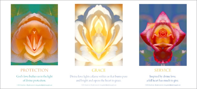 The Divine Love Triptych is based on the historical art form of three-panel paintings traditionally used for altarpieces. It is equally beautiful in a living room and a public space. Inspirational statements on the topics of (from left to right) Protection, Grace, and Service are reminders of the power divine love has to improve our lives. Posters are printed on high quality glossy paper with outstanding longevity. It produces beautiful photographs with bright whites and vivid colors. Other media are available by special order, including gallery-quality pearl, opalescent, and luster papers and canvas. 13 x 19 inches or custom sizes. Available individually at regular price, and as a set of three at 15% introductory discount through July 2012. Designed to hang side by side as shown. “Protection. God’s love bathes us in the light of protection.” “Grace. Divine love lights a flame within us that burns pure and bright and opens the heart to grace.” “Service. Inspired by divine love, a full heart has much to give.” Veterans’ groups, churches, and other non-profit organizations receive the 15% discount all year with a tax-exemption certificate. For details, pleaseEMAIL US.